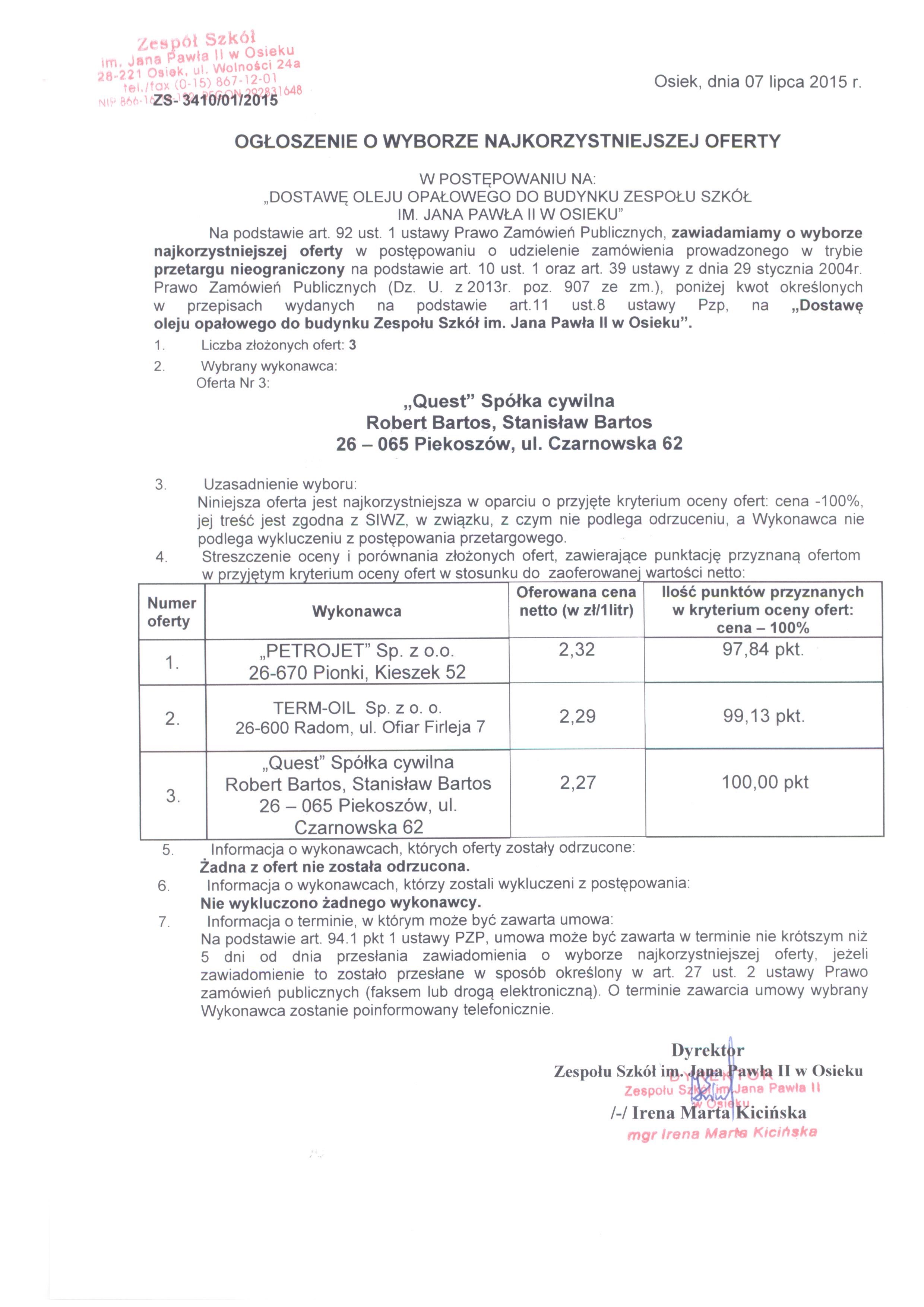 OGŁOSZENIE O WYBORZE NAJKORZYSTNIEJSZEJ OFERTY W POSTĘPOWANIU NA: „DOSTAWĘ OLEJU OPAŁOWEGO DO BUDYNKU ZESPOŁU SZKÓŁ IM. JANA PAWŁA II W OSIEKU”